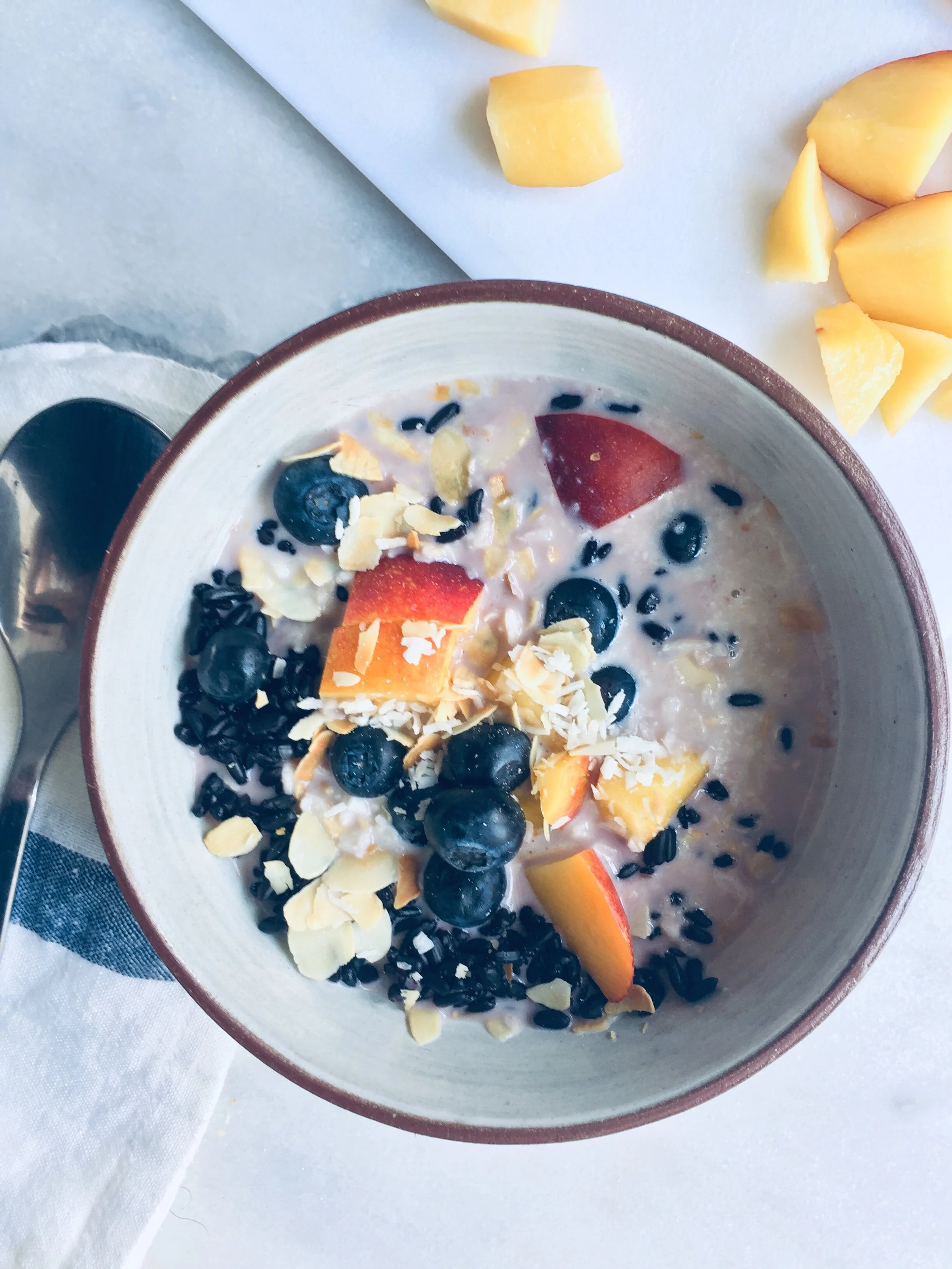 I love summer fruits and can never have enough of them! This is a very nice change from the usual bowl of steel-cut oats most mornings. Any rice will work, but forbidden black rice makes this just a tiny bit better. I love the added taste, texture and protein this Ancient Chinese rice provides. This rice does take 1 hour to cook, like brown typically does. I find a rice cooker to be perfect for this. I start the rice and enjoy my morning coffee before I prepare the fruit. I hope you enjoy this as much as I do for breakfast.