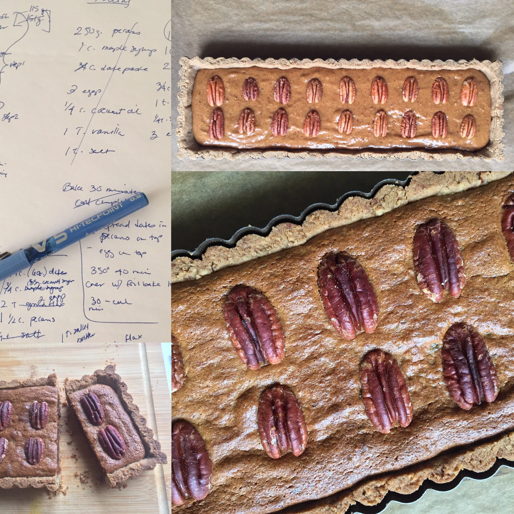 I’ve never been a cake person, always preferring pie. Pecan pie is my very favorite pie. However, it’s one I’ve skipped for many years due to most recipes requiring corn syrup and them just being cloyingly sweet. So this holiday season I challenged myself to recreate my favorite pie, a tad healthier. I did use cane sugar in the crust, in my very favorite pate sucre recipe, however, you can substitute coconut sugar is you like. This crust is amazing, due to the addition of egg, which means it rolls out beautifully without tearing. I view this as a celebration food, to be shared with friends and family once in awhile. You can also use any pie pan or tart pan you like (I used a 15” (38cm) non-stick rectangular tart pan).